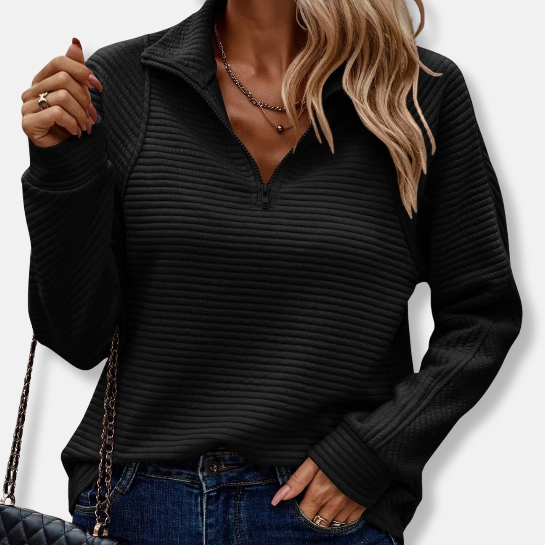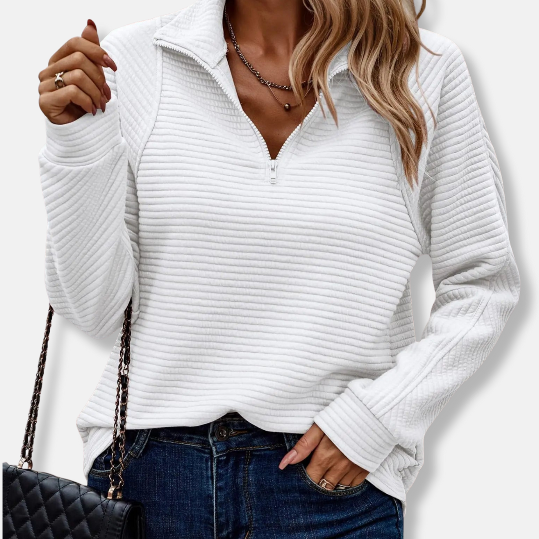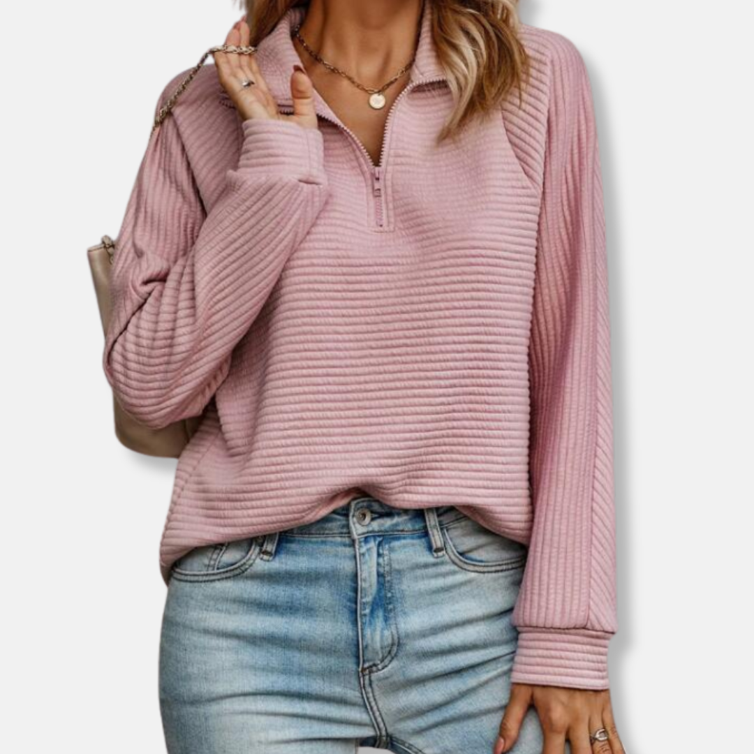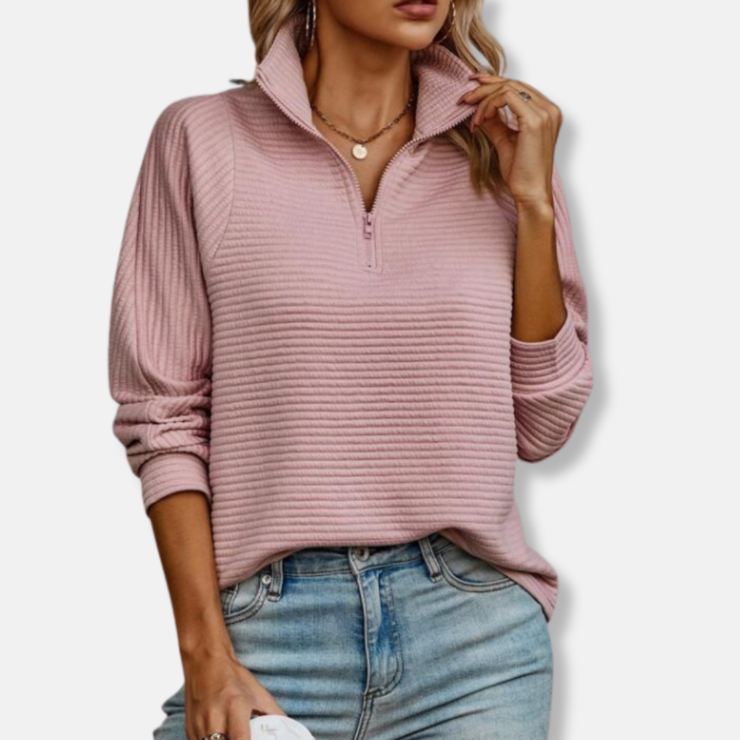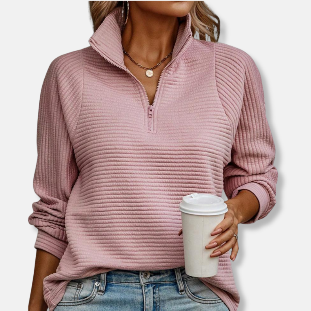 Den stilrena Ella-tröjan kombinerar en avslappnad passform med en modern ståkrage och halv dragkedja. Den ribbade texturen ger en elegant struktur och ett lyxigt utseende, perfekt för både vardag och lediga tillfällen. En mjuk och bekväm tröja som håller dig varm och samtidigt ser trendig ut.