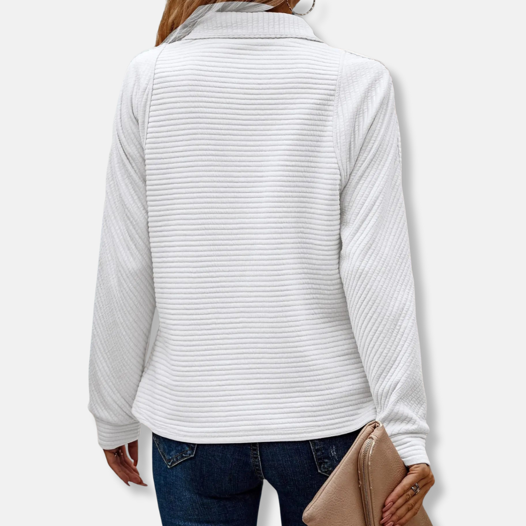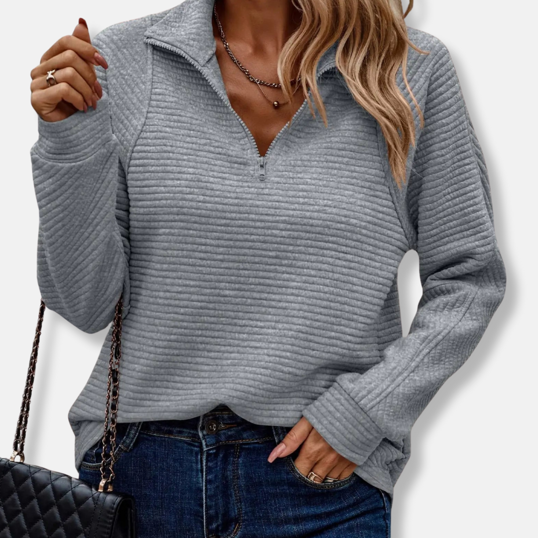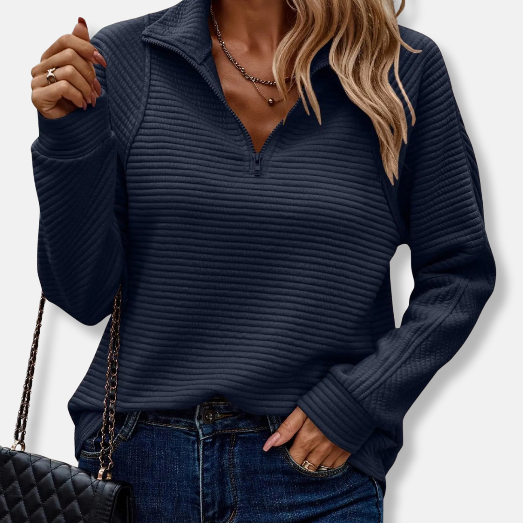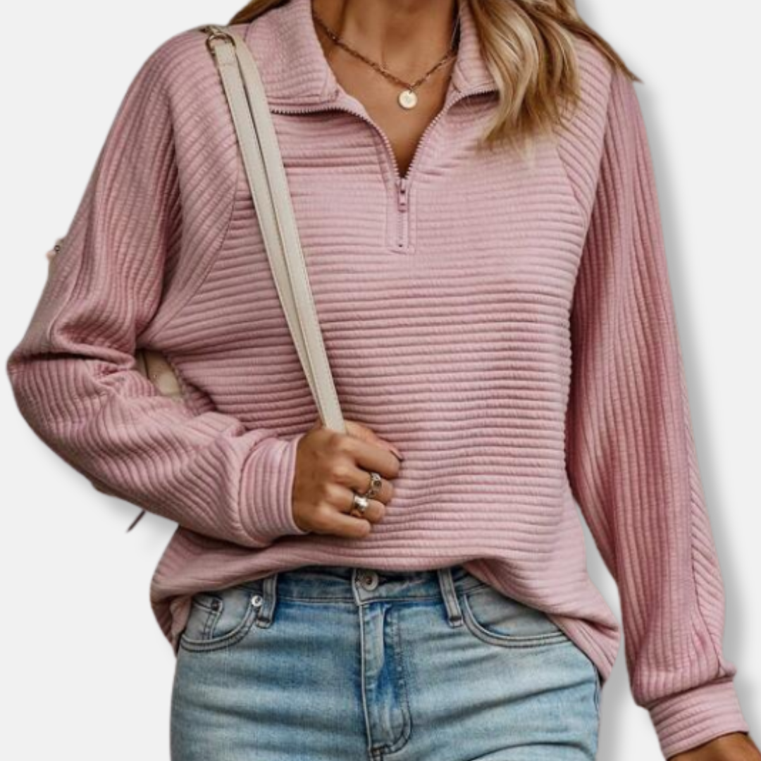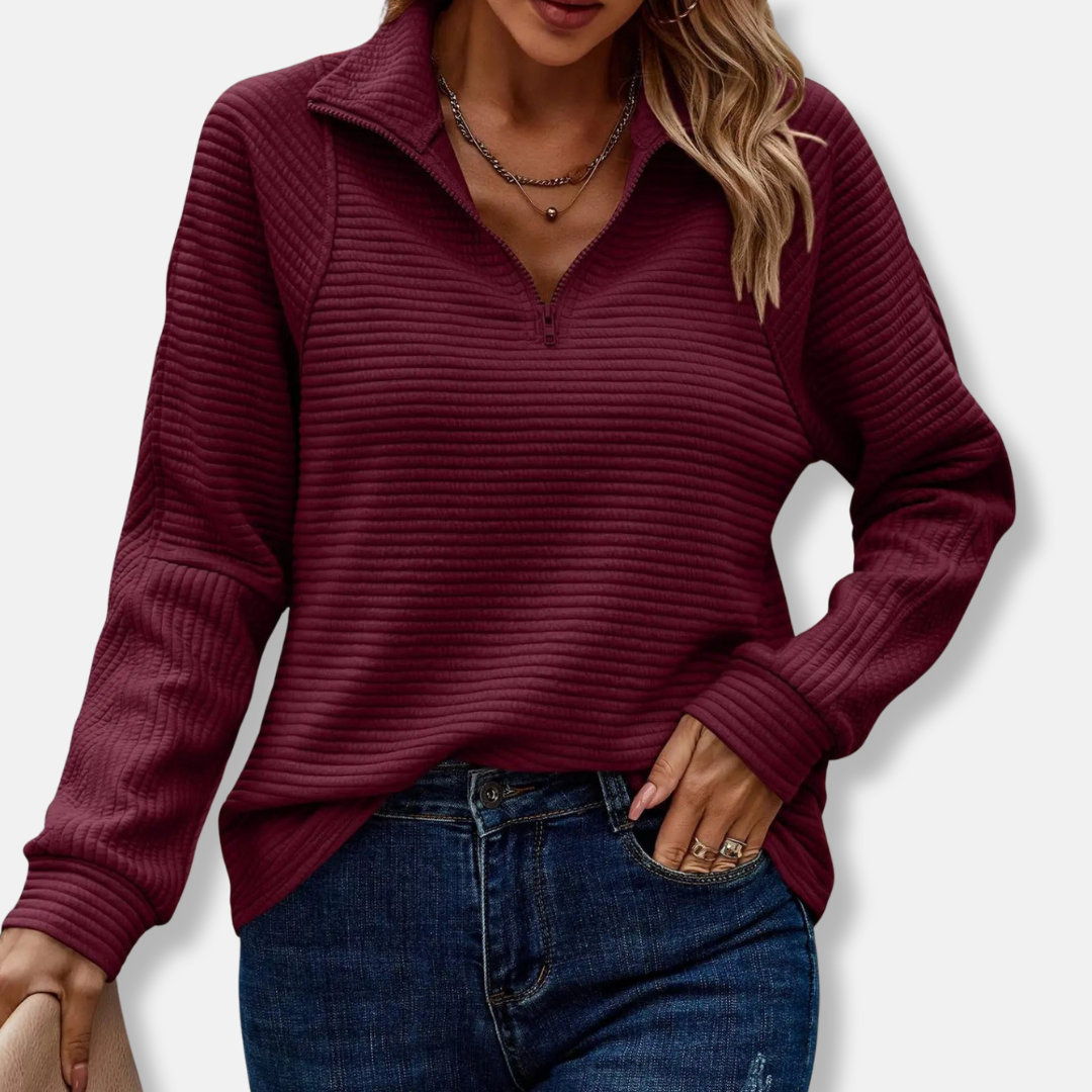 Den stilrena Ella-tröjan kombinerar en avslappnad passform med en modern ståkrage och halv dragkedja. Den ribbade texturen ger en elegant struktur och ett lyxigt utseende, perfekt för både vardag och lediga tillfällen. En mjuk och bekväm tröja som håller dig varm och samtidigt ser trendig ut.