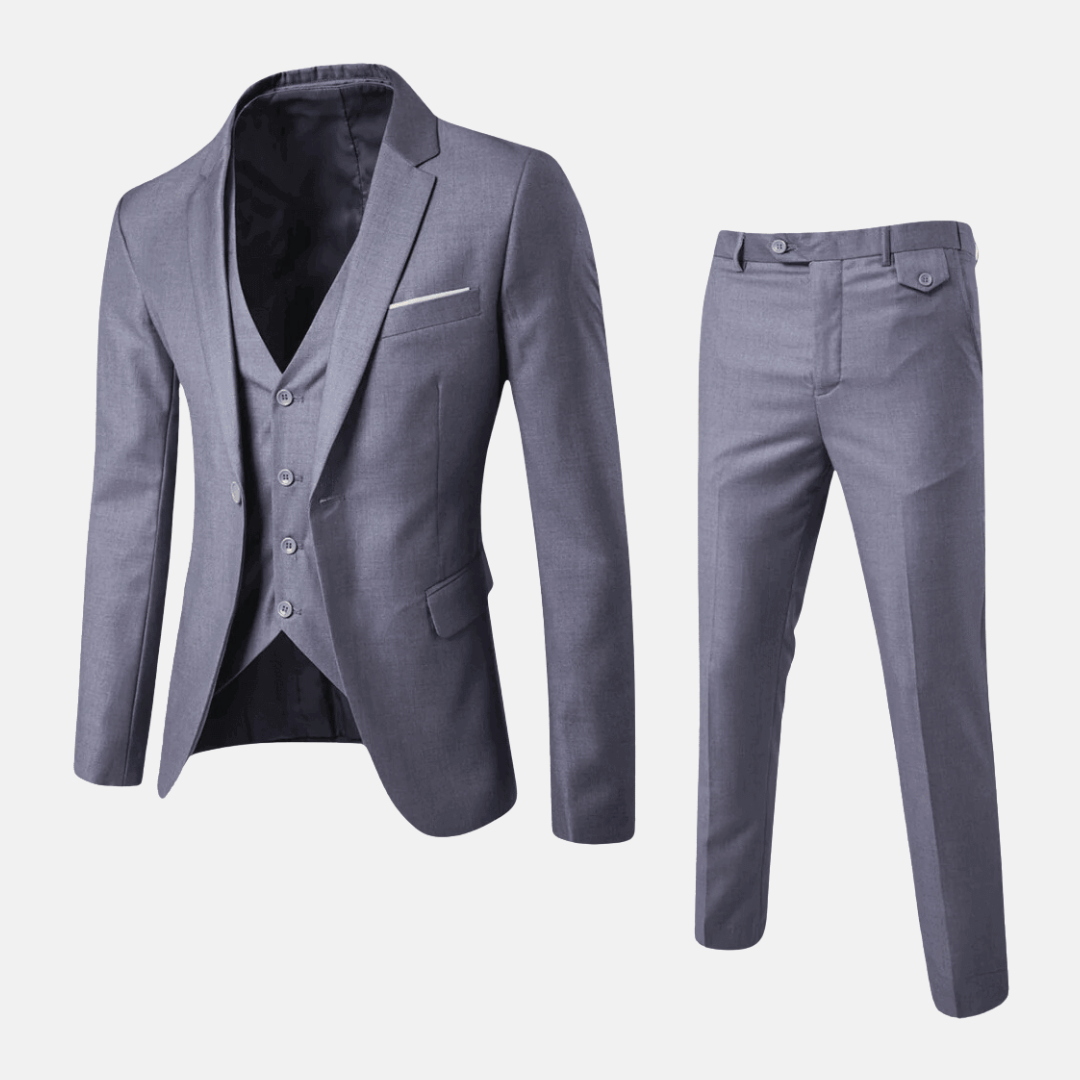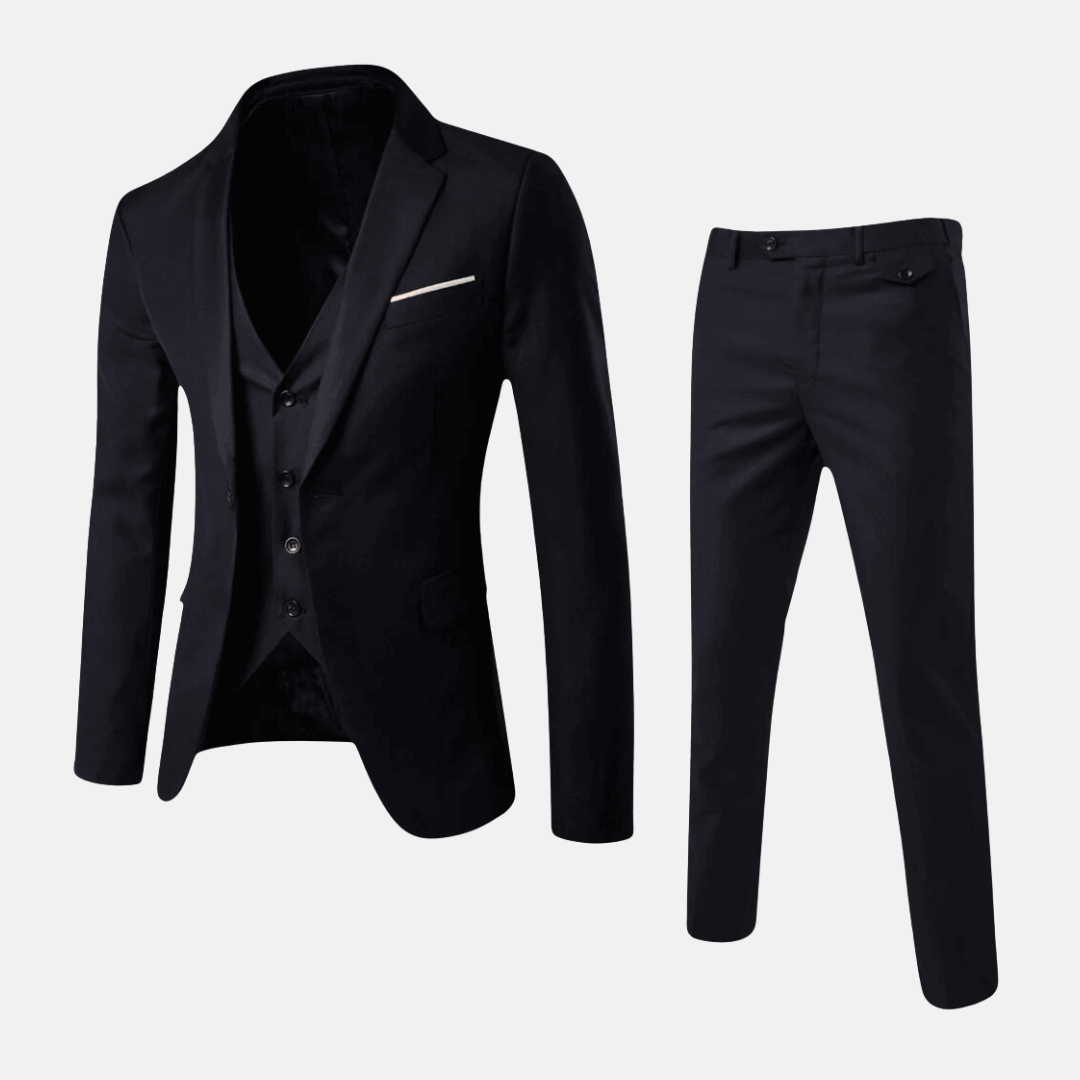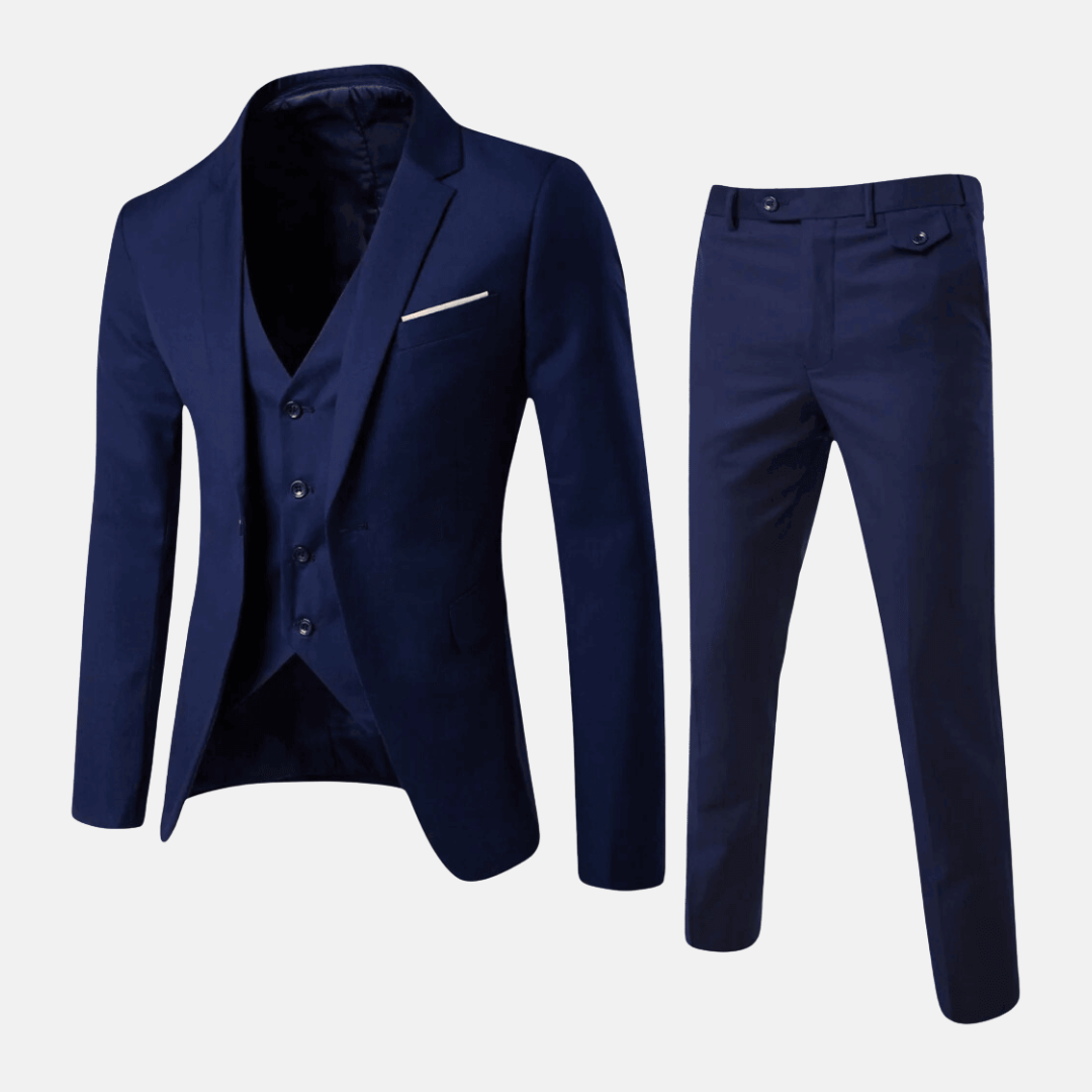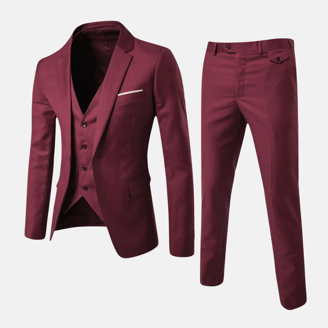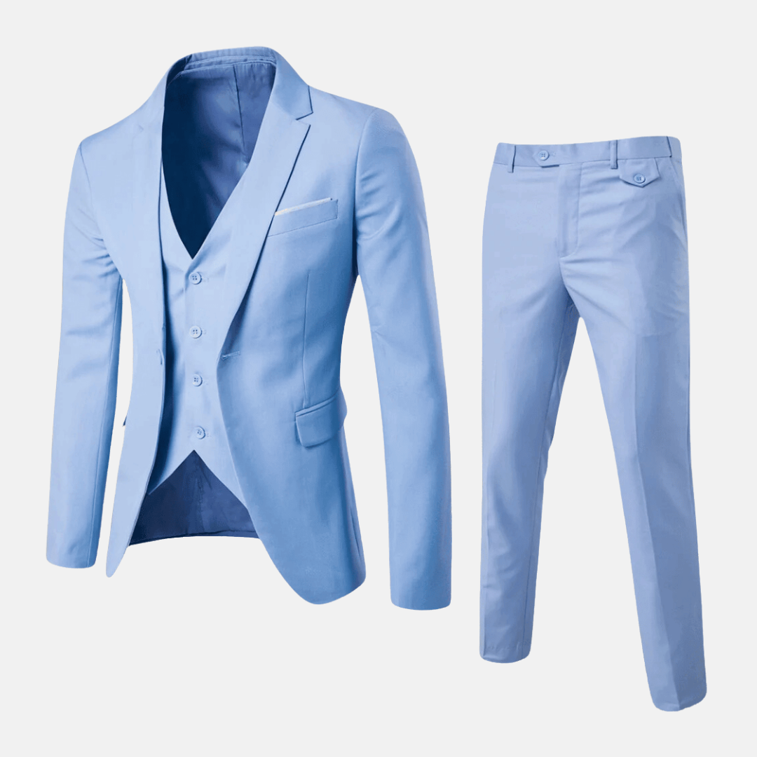Detta tvådelade kostymset är skräddarsytt för män och erbjuder en sofistikerad stil för formella tillfällen. Setet inkluderar en figursydd kavaj med krage, långa ärmar och höftlängd, samt en matchande väst med V-ringning och ett par smala, hellånga kostymbyxor. Kavajen har knappstängning, skårade slag och fickor med lock, medan västen också har knappstängning och byxorna är utrustade med bälteshällor och fickor.