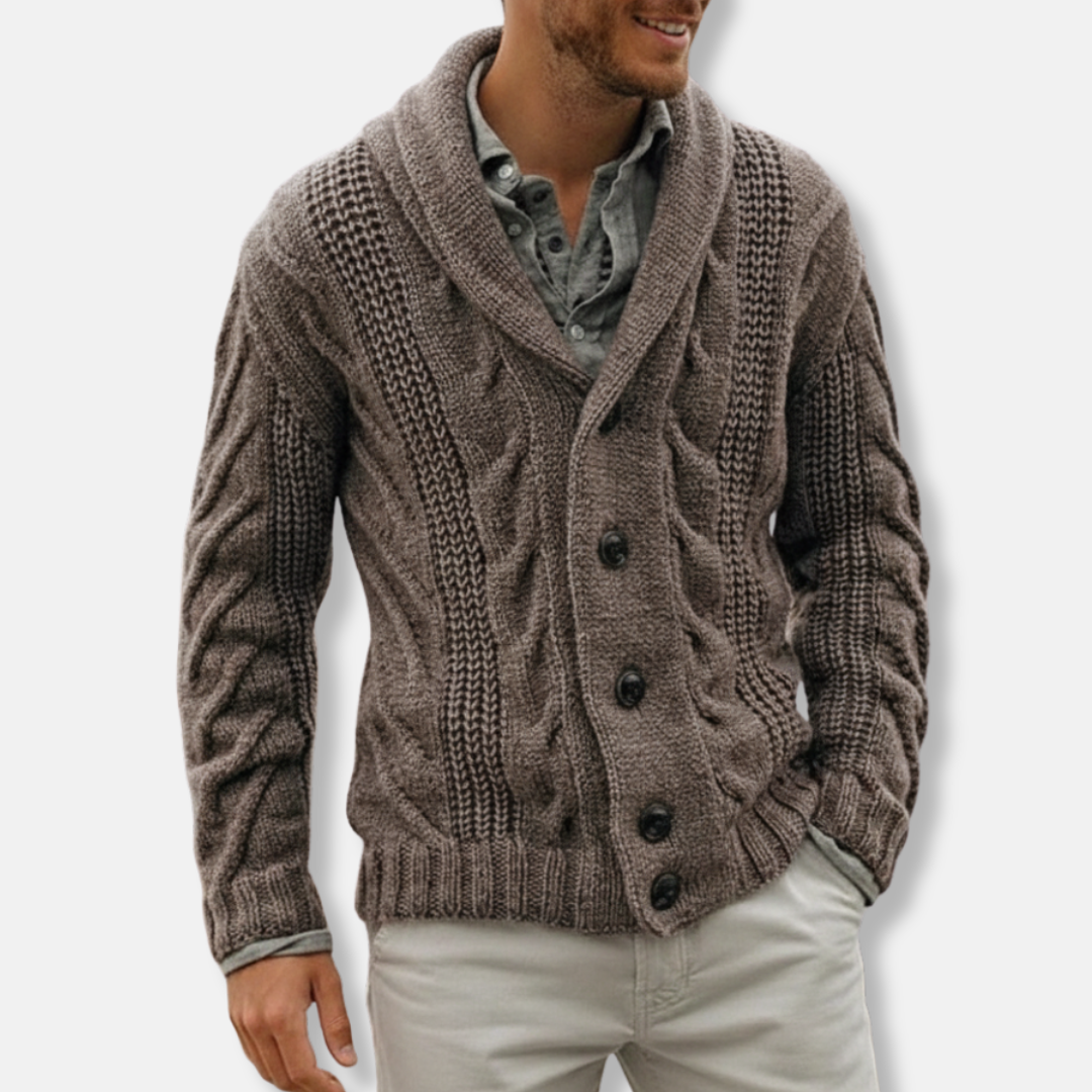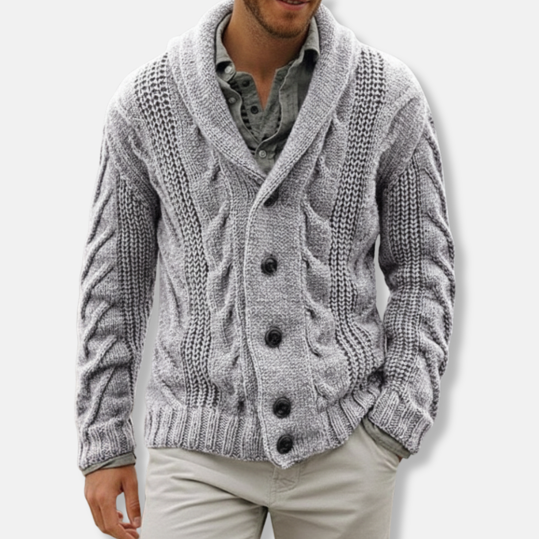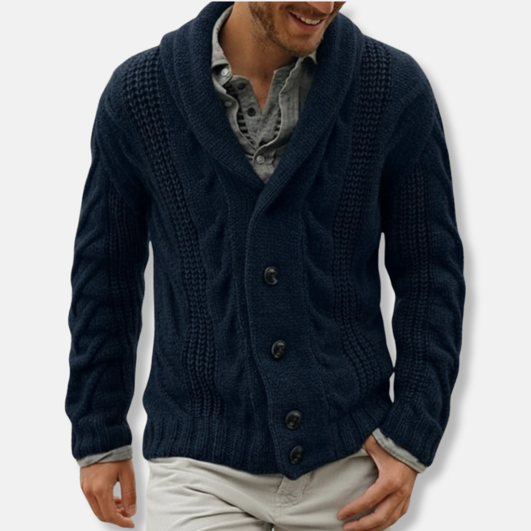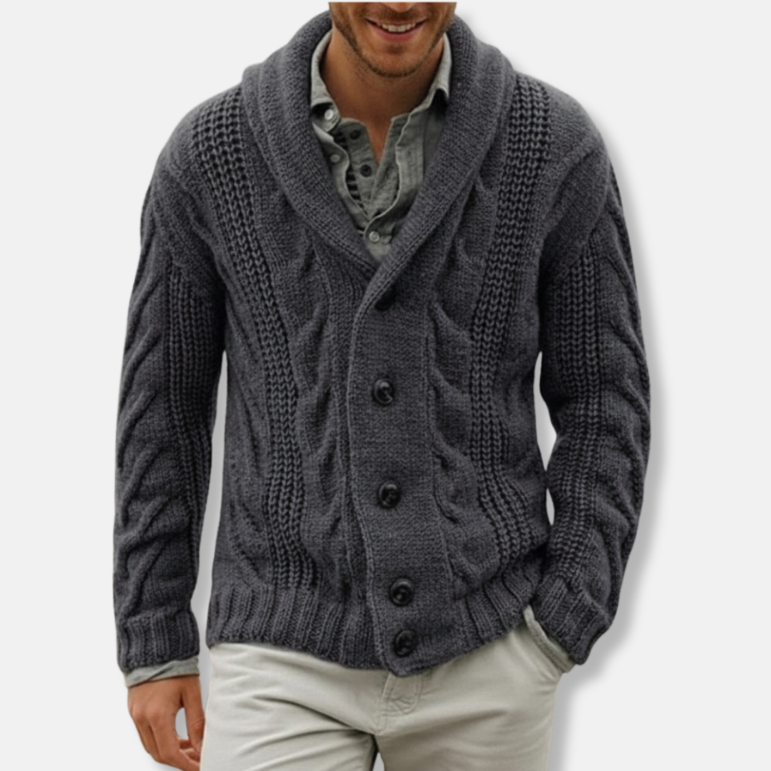 Den klassiska Oscar-koftan är ett måste för varje man som uppskattar tidlös stil och komfort. Med sin kabelstickade design och eleganta sjalkrage erbjuder den både värme och en sofistikerad look. Perfekt för lager-på-lager under höst och vinter, eller som ett stilfullt ytterplagg under mildare dagar.