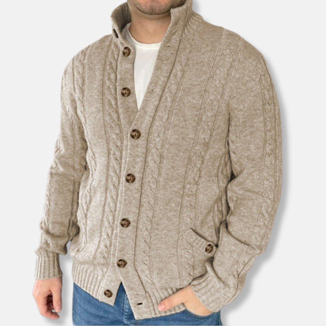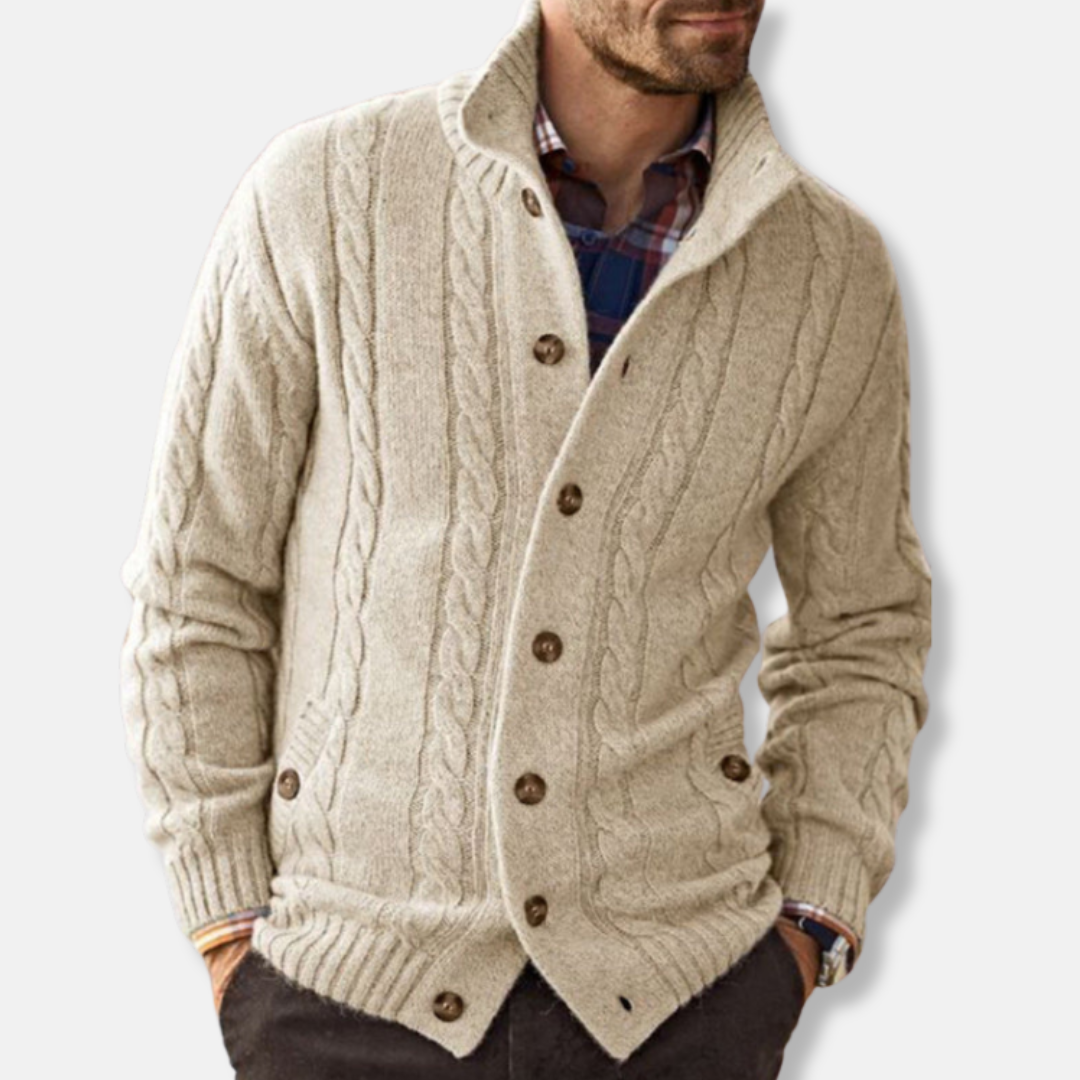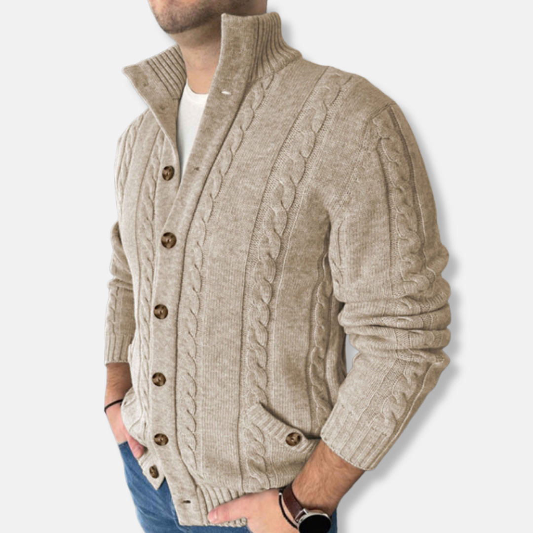 Denna kabelstickade kofta erbjuder en tidlös stil med sin eleganta ståkrage. Dess höftlånga silhuett skapar en mångsidig profil som passar utmärkt för en sofistikerad vardagslook.