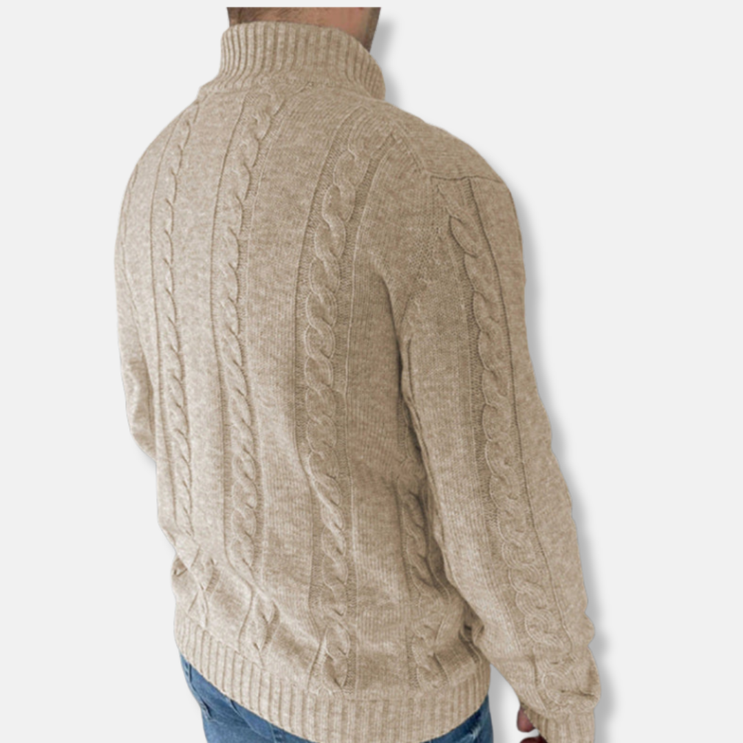 Design: En höftlång silhuett med en kabelstickad design-detalj.