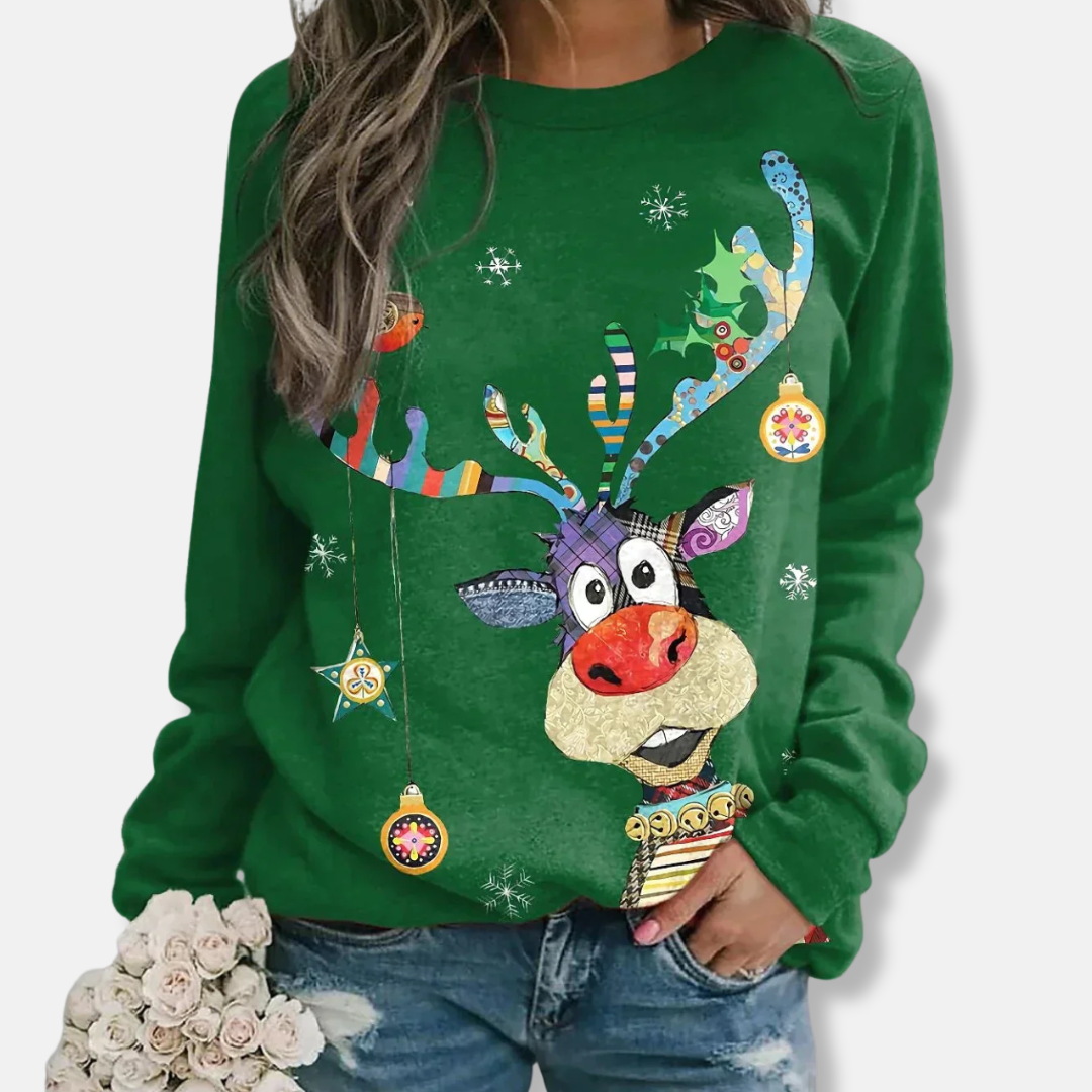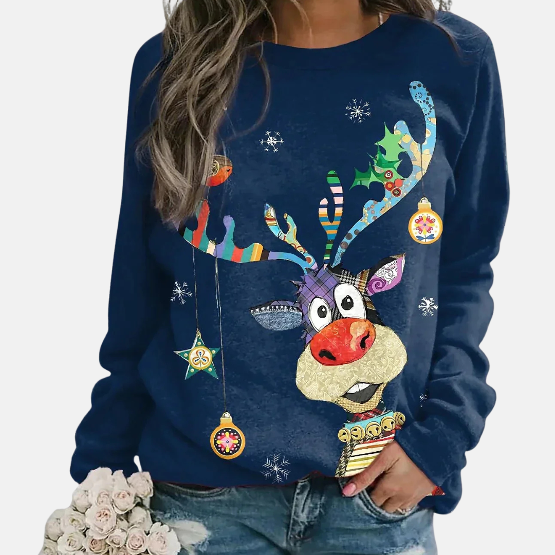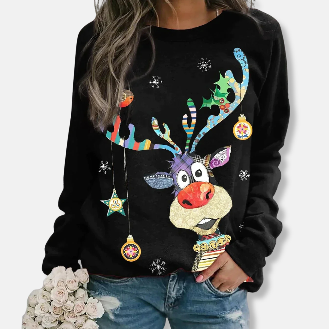 För kvinnor som söker en bekväm stil för fritiden, erbjuder denna långärmade tröja en avslappnad passform och en klassisk rundhalsad design. Dess höftlånga silhuett är prydd med ett festligt julmotiv, framhävt av ett grafiskt tryck och en detaljerad patchwork-design.