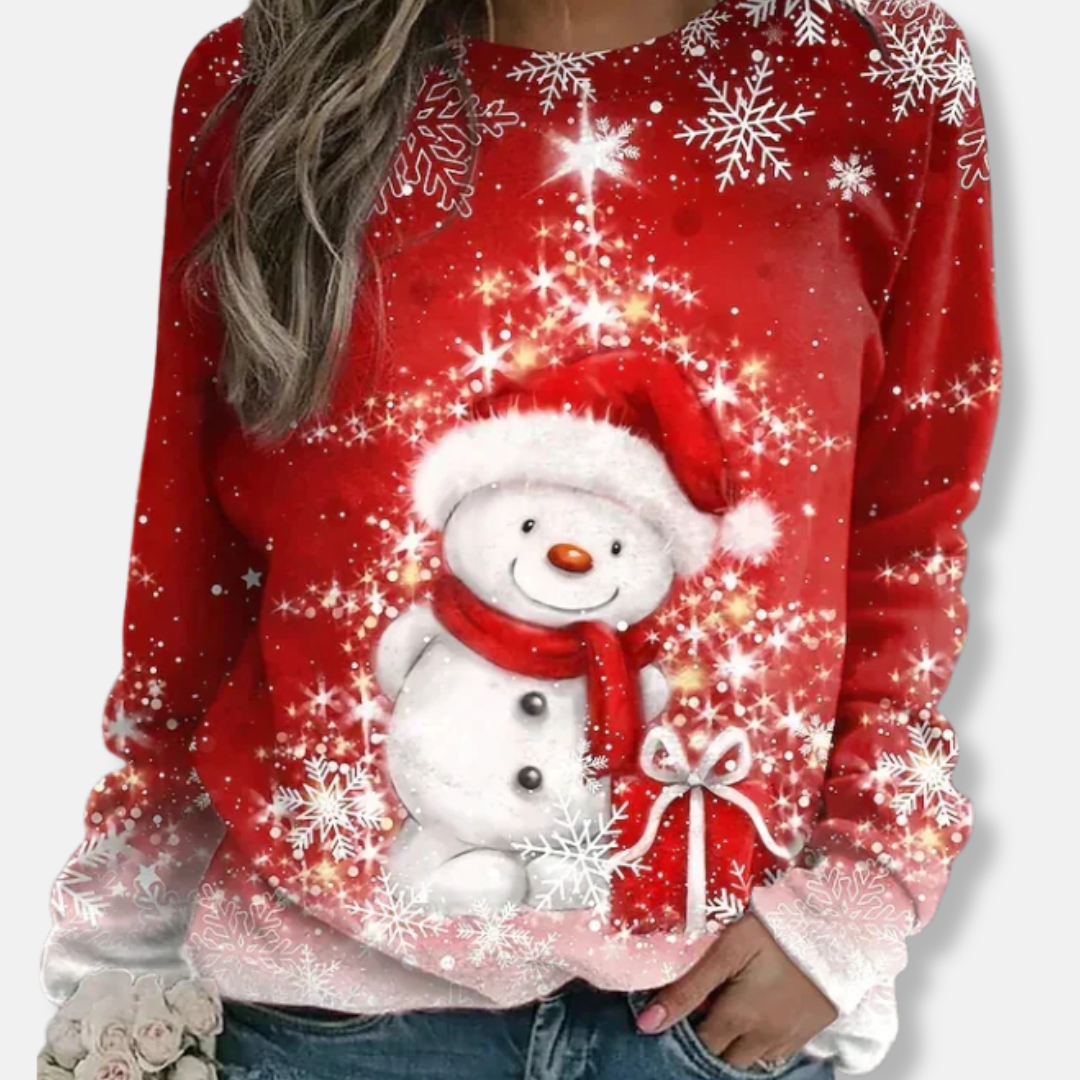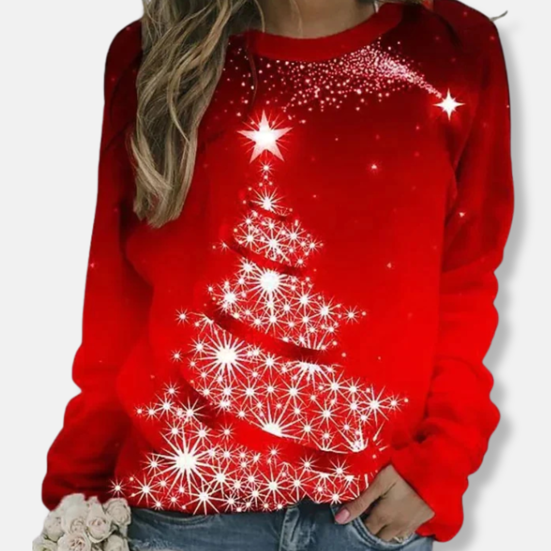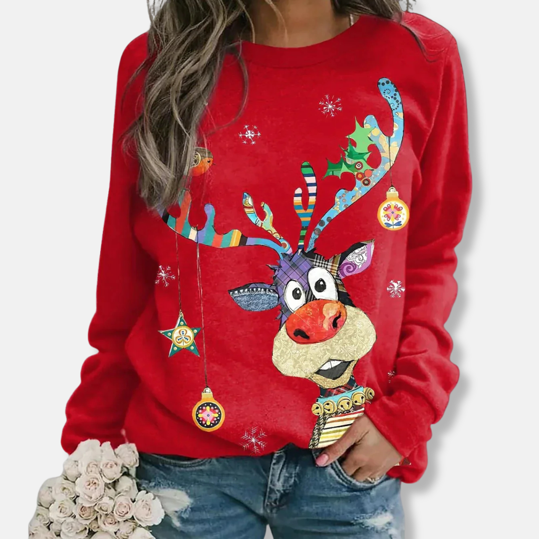 För kvinnor som söker en bekväm stil för fritiden, erbjuder denna långärmade tröja en avslappnad passform och en klassisk rundhalsad design. Dess höftlånga silhuett är prydd med ett festligt julmotiv, framhävt av ett grafiskt tryck och en detaljerad patchwork-design.