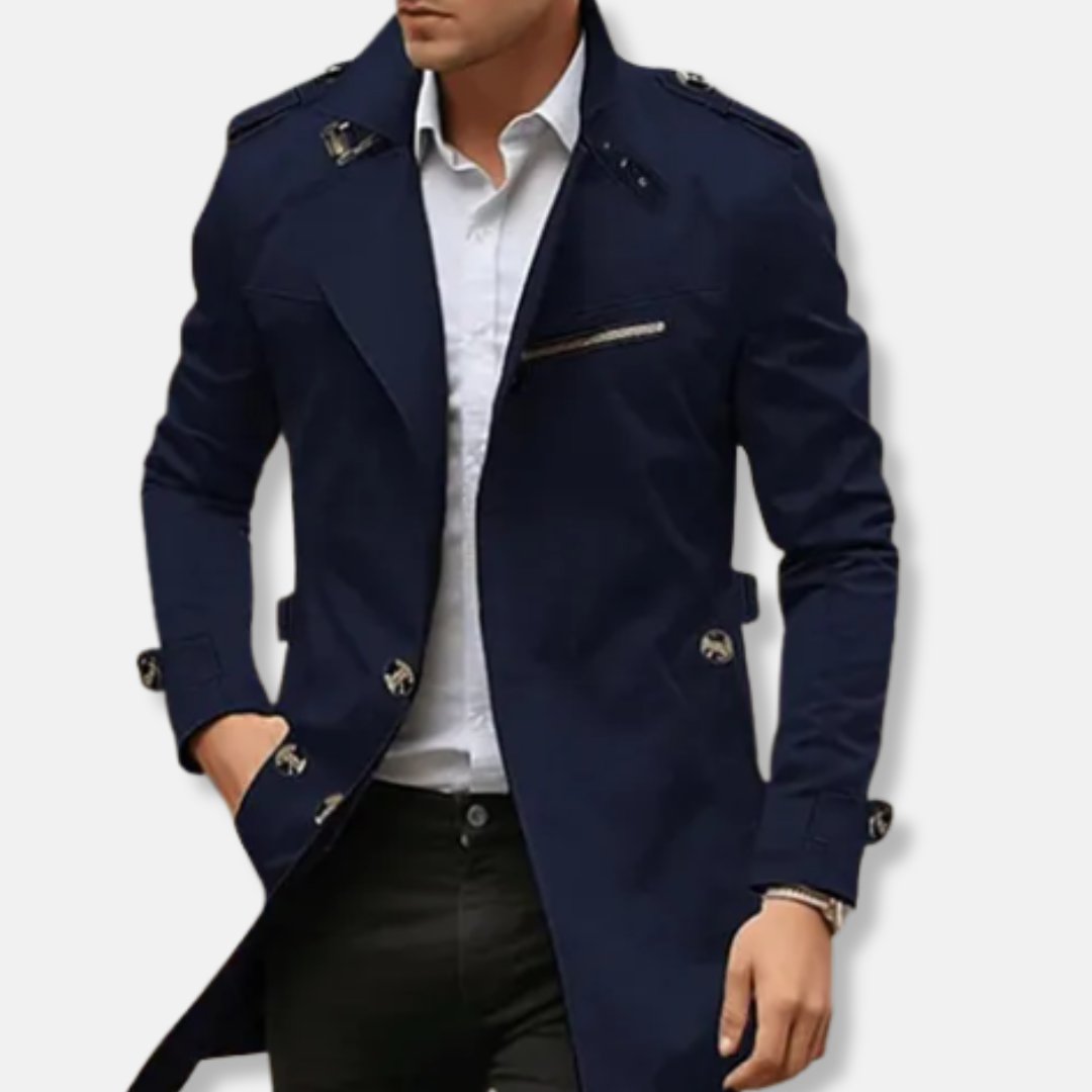 Denna eleganta trenchcoat kombinerar modern design med klassisk stil. Med sin smala passform, höga krage och lårlånga längd ger den en sofistikerad och tidlös look för varje tillfälle. Den är perfekt för män som vill ha en stilren och strukturerad outfit både till vardag och fest.